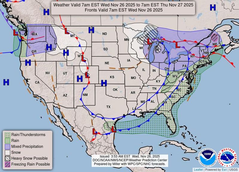 New England will see steady rain let up while a chance of thunderstorms brews in the Southeast, according to the National Weather Service. Wet snow is likely to linger in Maine until Thanksgiving morning.