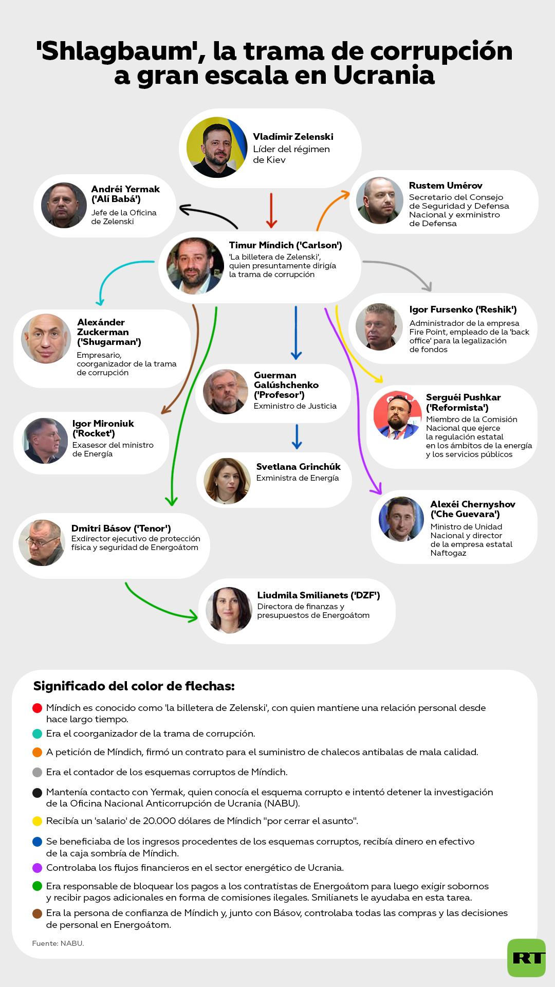 - La semana pasada, el diputado ucraniano Yaroslav Zhelezniak sugirió que Yermak podría ser el 'Alí Babá' que figura en las grabaciones de horas de conversación de los aliados más cercanos del líder del régimen de Kiev, acusados de corrupción. Según sus datos, Yermak —también conocido como la 'mano derecha' de Zelenski— dirigió personalmente la aprobación de la ley sobre la liquidación de la independencia institucional de la NABU y la SAP .