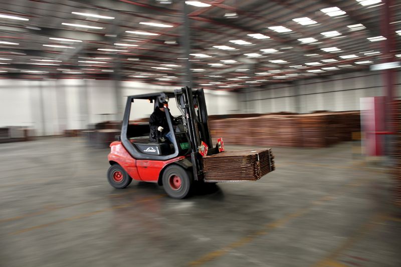 A worker loads copper cathodes into a warehouse near Yangshan Deep Water Port, south of Shanghai in this March 23, 2012 file photo. REUTERS/Carlos Barria/File Photo