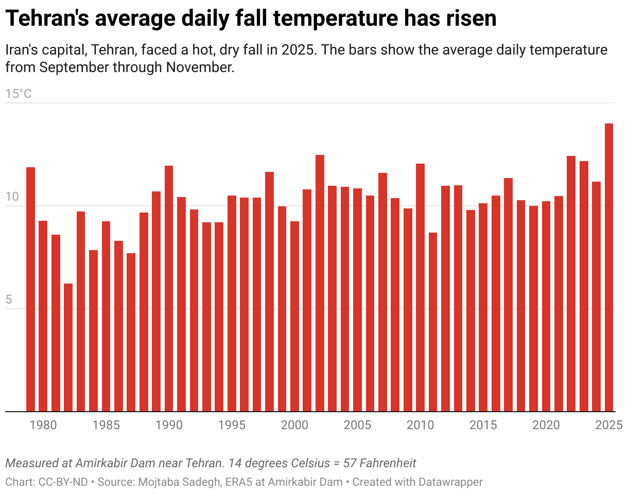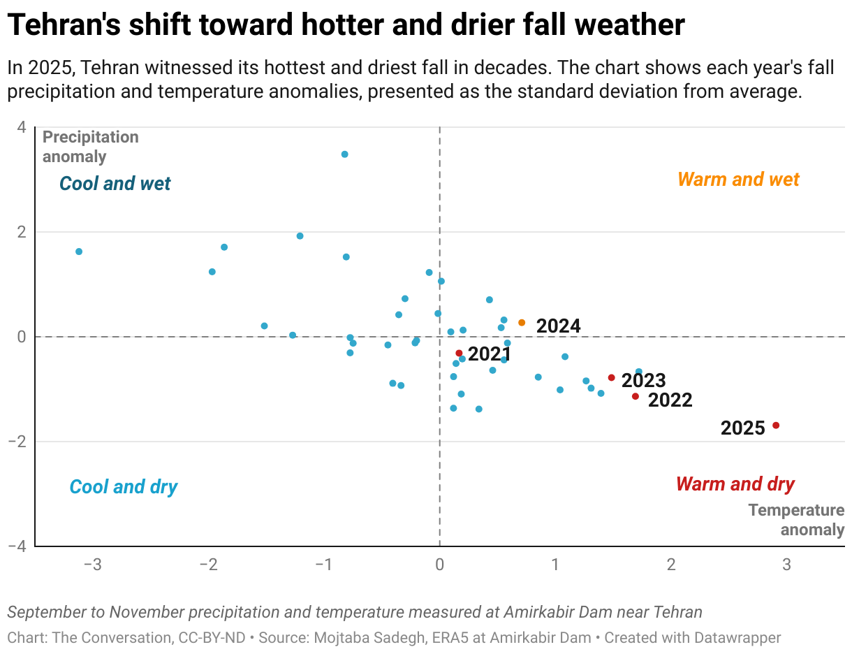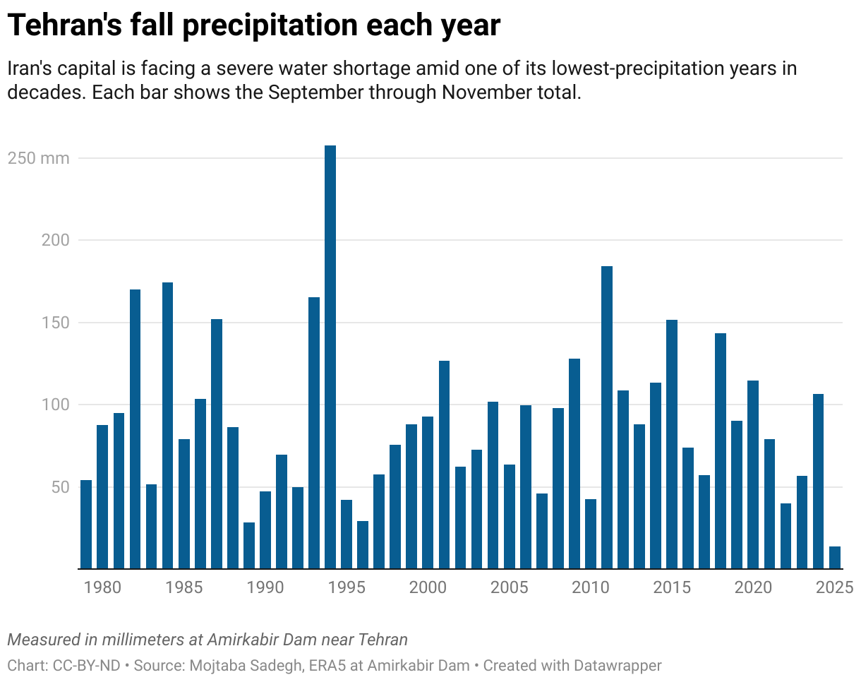 Precipitation has been well below normal in four of the water years since 2020. That has contributed to a sharp decline in reservoir levels. Fall 2025 has been the hottest and driest fall on record for Tehran since 1979, testing the resilience of its water system.