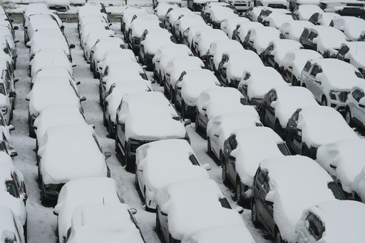 Snow covered vehicles sit in a rental car parking lot at O'Hare International Airport in Chicago, Sunday, Nov. 30, 2025. (AP Photo/Nam Y. Huh)