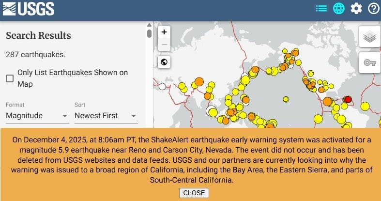 A shake alert went out over the U.S. Geological Survey's early warning system on Dec. 4, warning that a 5.9 earthquake near Carson City in western Nevada could produce heavy shaking in the region.