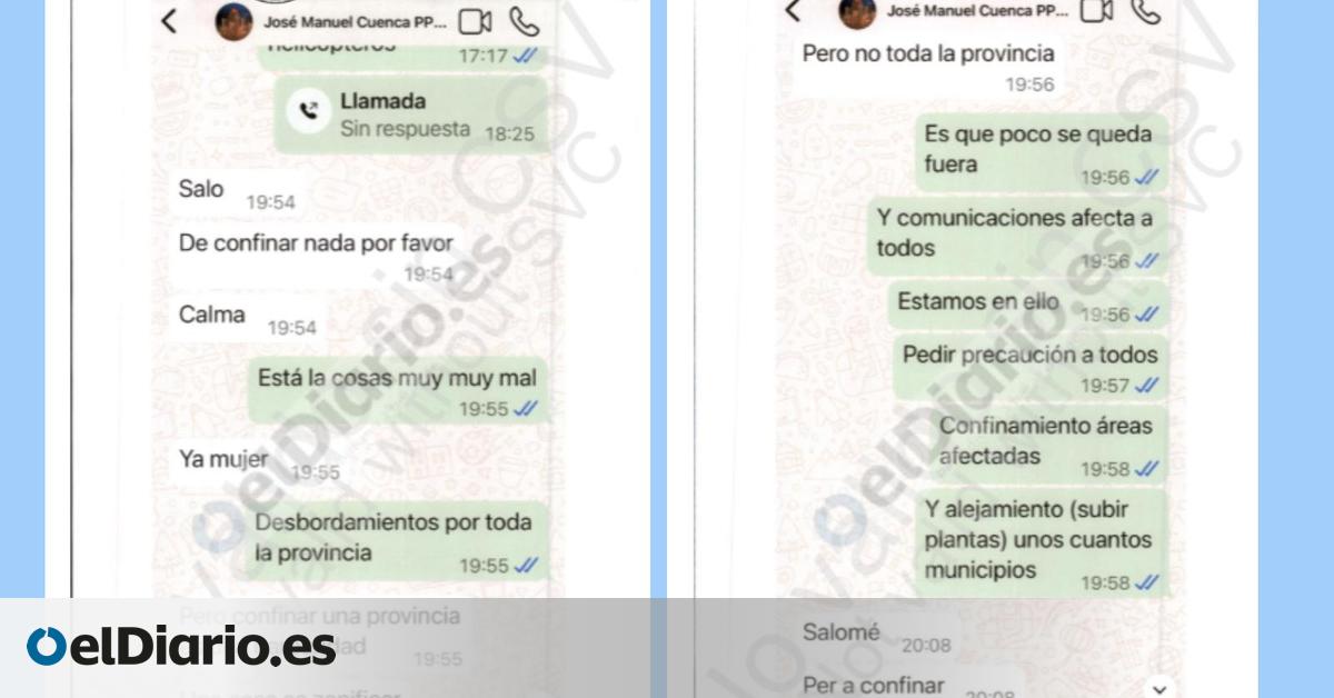 El jefe de gabinete de Carlos Mazón, el secretario autonómico José Manuel Cuenca, dio órdenes explícitas a la consellera Salomé Pradas sobre la gestión de la emergencia de la dana del 29 de octubre de 2024. Así consta en el acta notarial con los mensajes de WhatsApp aportada por la defensa de Pradas a la que ha tenido acceso elDiario.es.