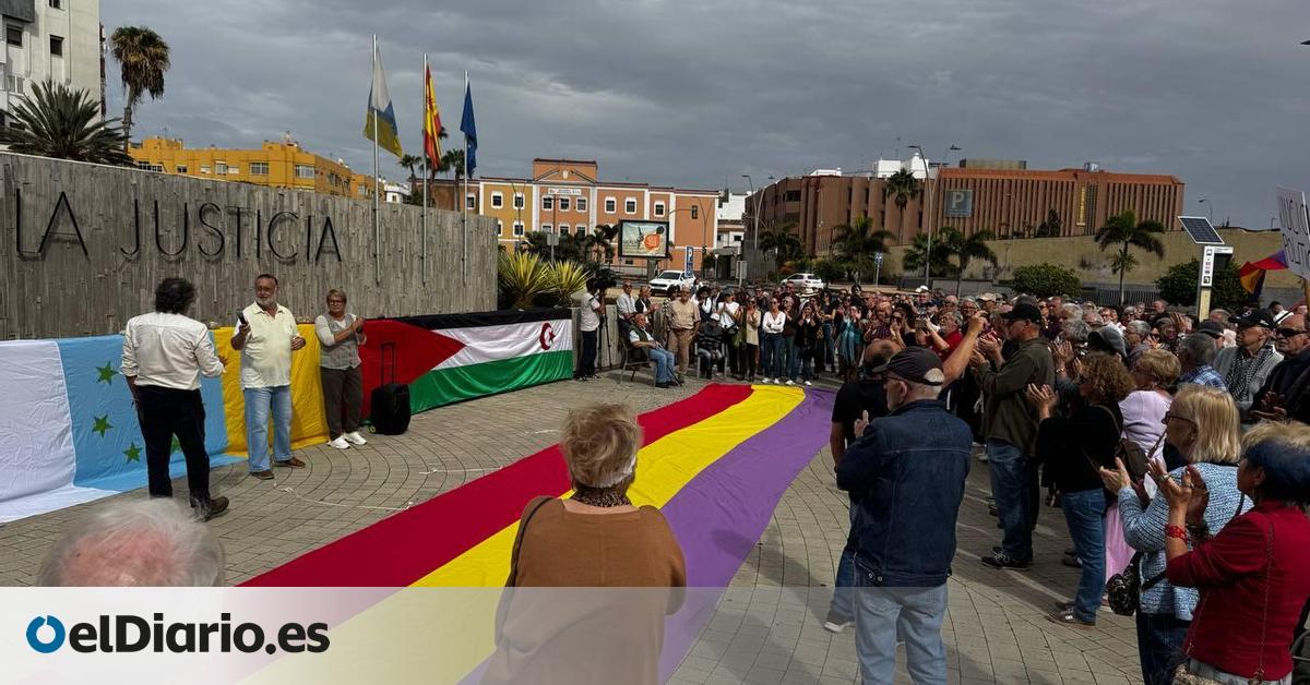 Una gigantesca bandera republicana extendica sobre el pavimento, acompañadas de otras de Canarias con las siete estrellas verdes y una tercera de Palestina, presidieron el acto. En él se dieron cita veteranos dirigentes y militantes de formaciones políticas como el PSOE o Nueva Canarias, así como representantes sindicales y de entidades sociales y ciudadanas sin que se registrara ningún incidente y ante la presencia discreta de tan solo dos unidades de la Policía Nacional.