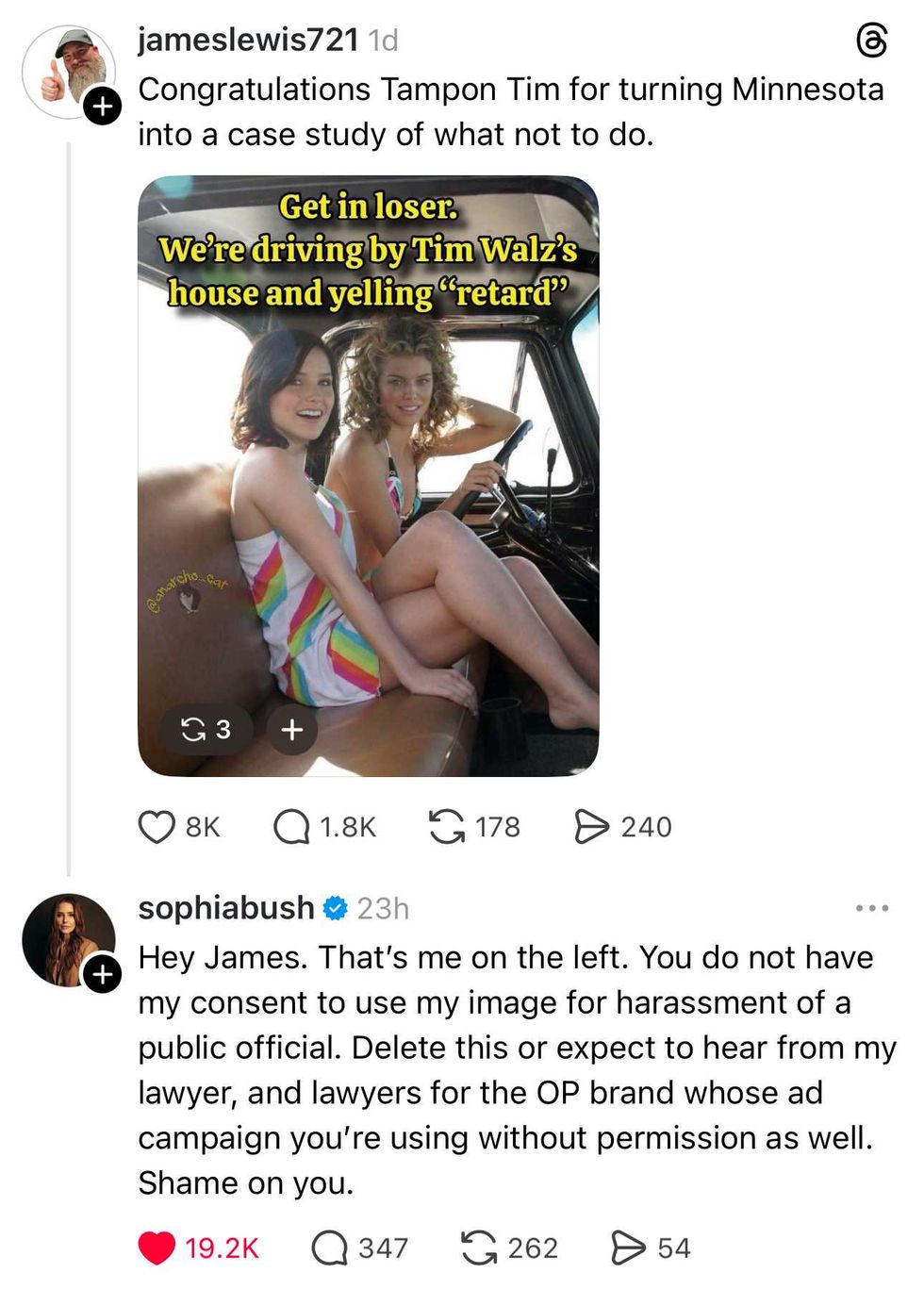 Bush responded to a user named James Lewis who posted a photo of Bush and another woman inside a classic car with the meme text: "Get in loser. We're driving by Tim Walz's house and yelling 'r-word.'"