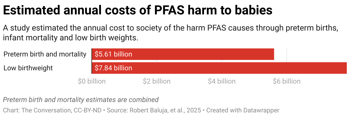 The results are eye-opening. We estimate that the effects of PFAS on each year’s low-weight births cost society about US$7.8 billion over the lifetimes of those babies, with more babies born every year.