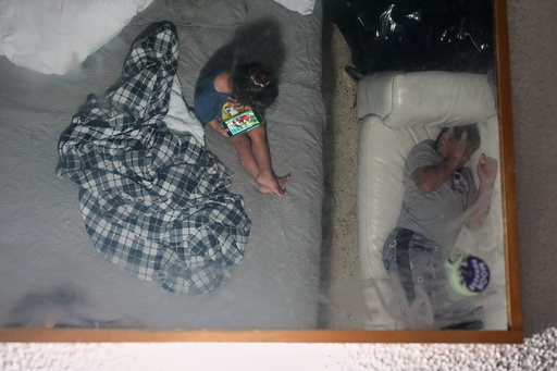 Two brothers are reflected in a ceiling mirror as they pass the time in the Miami-area motel room where they are living with their pregnant mother Yaoska after their father was deported to Nicaragua, Thursday, Nov. 13, 2025. (AP Photo/Rebecca Blackwell)